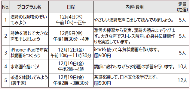 申込方法:はがき、ファクス(「その他のお知らせ」の「はがき等の記入例」参照。希望プログラム名も記入)、電話または直接窓口で、11月25日(火)(必着)まで